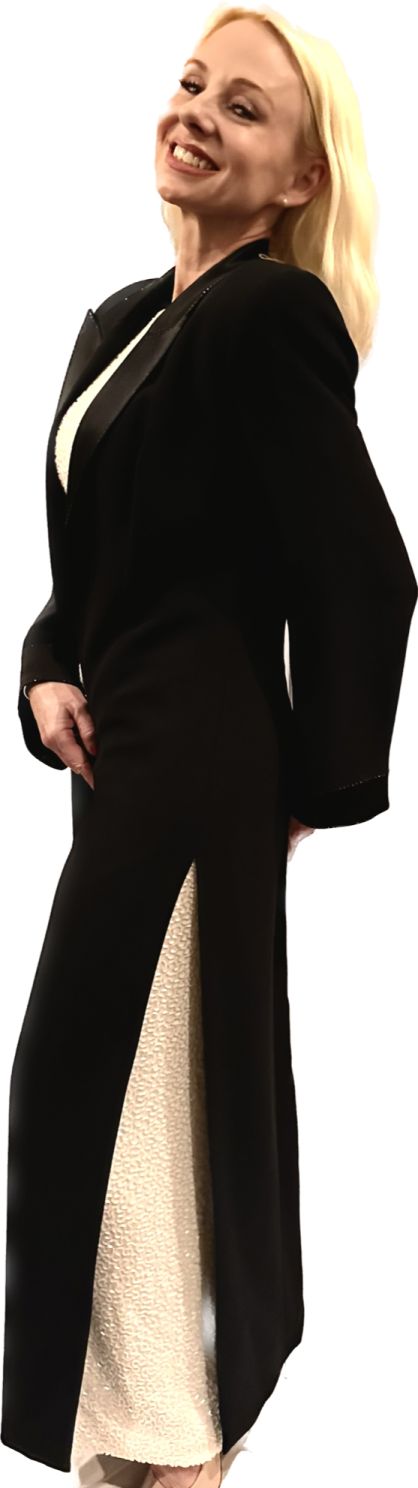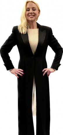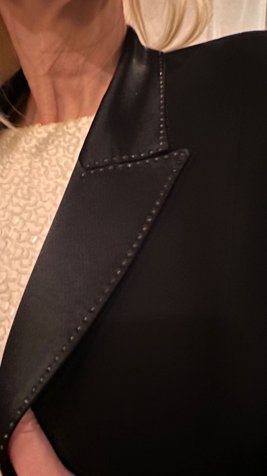Designed in Black with elongated notch collar, in satin encircled with tonal black beading .