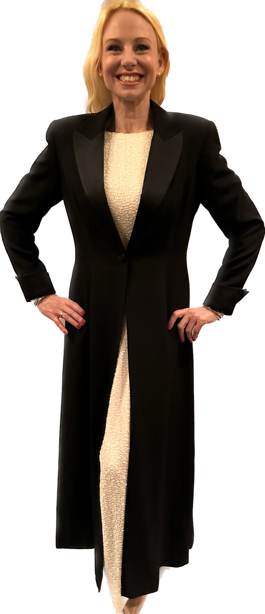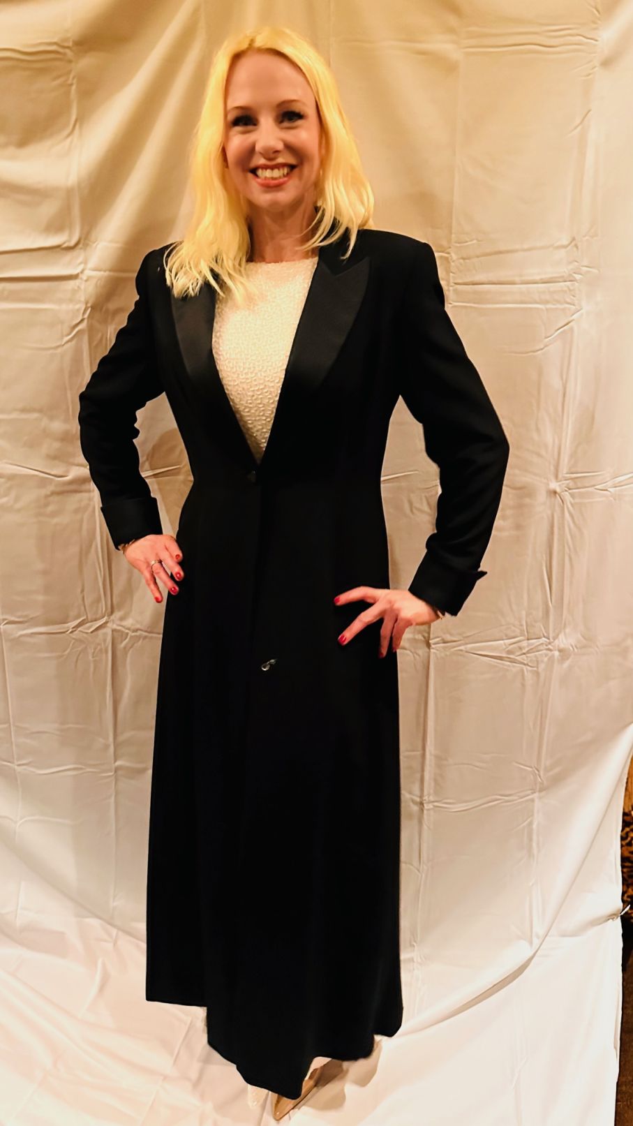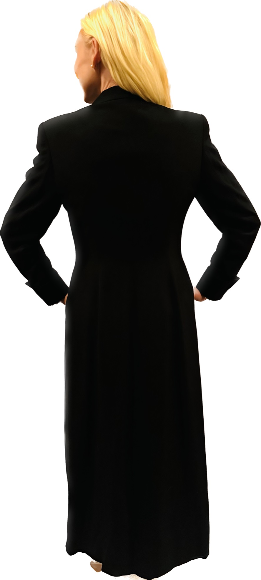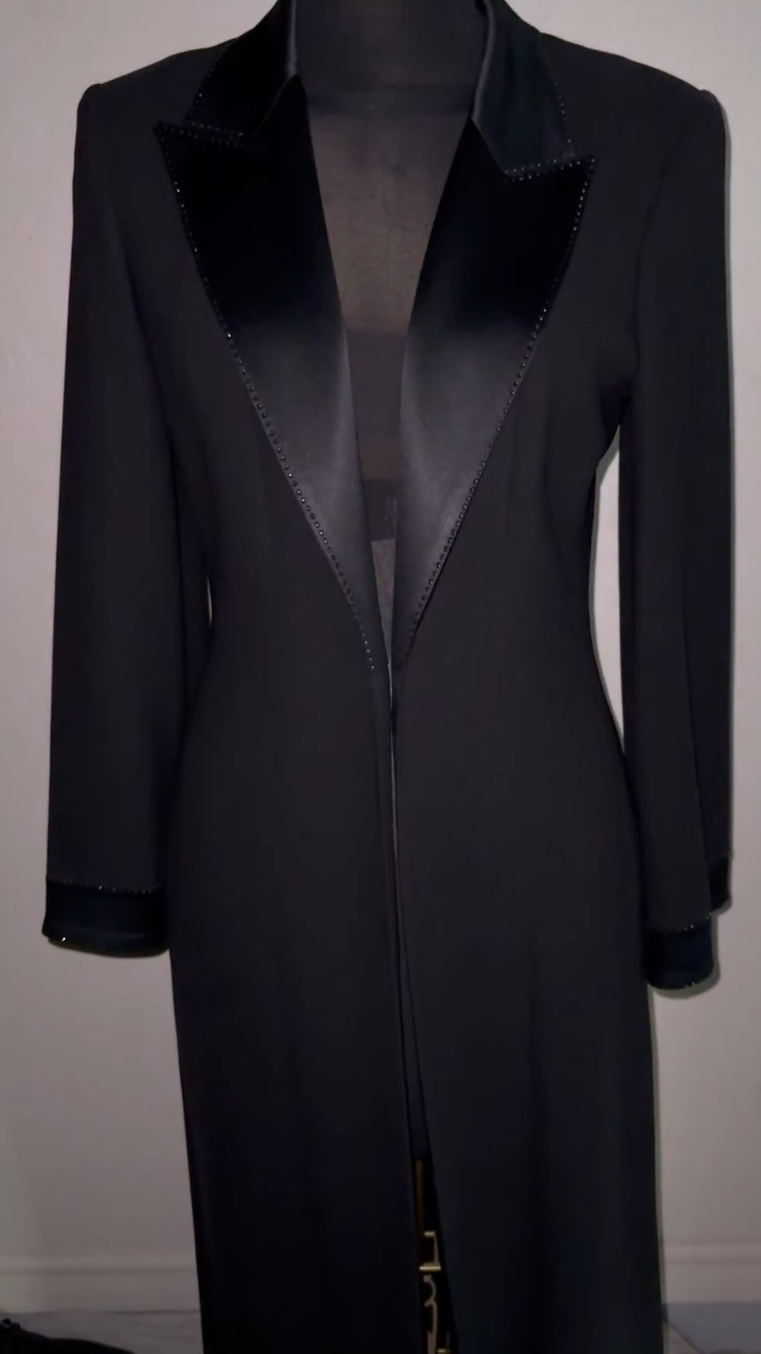 Black, long, One button,Evening coat….54 inches long