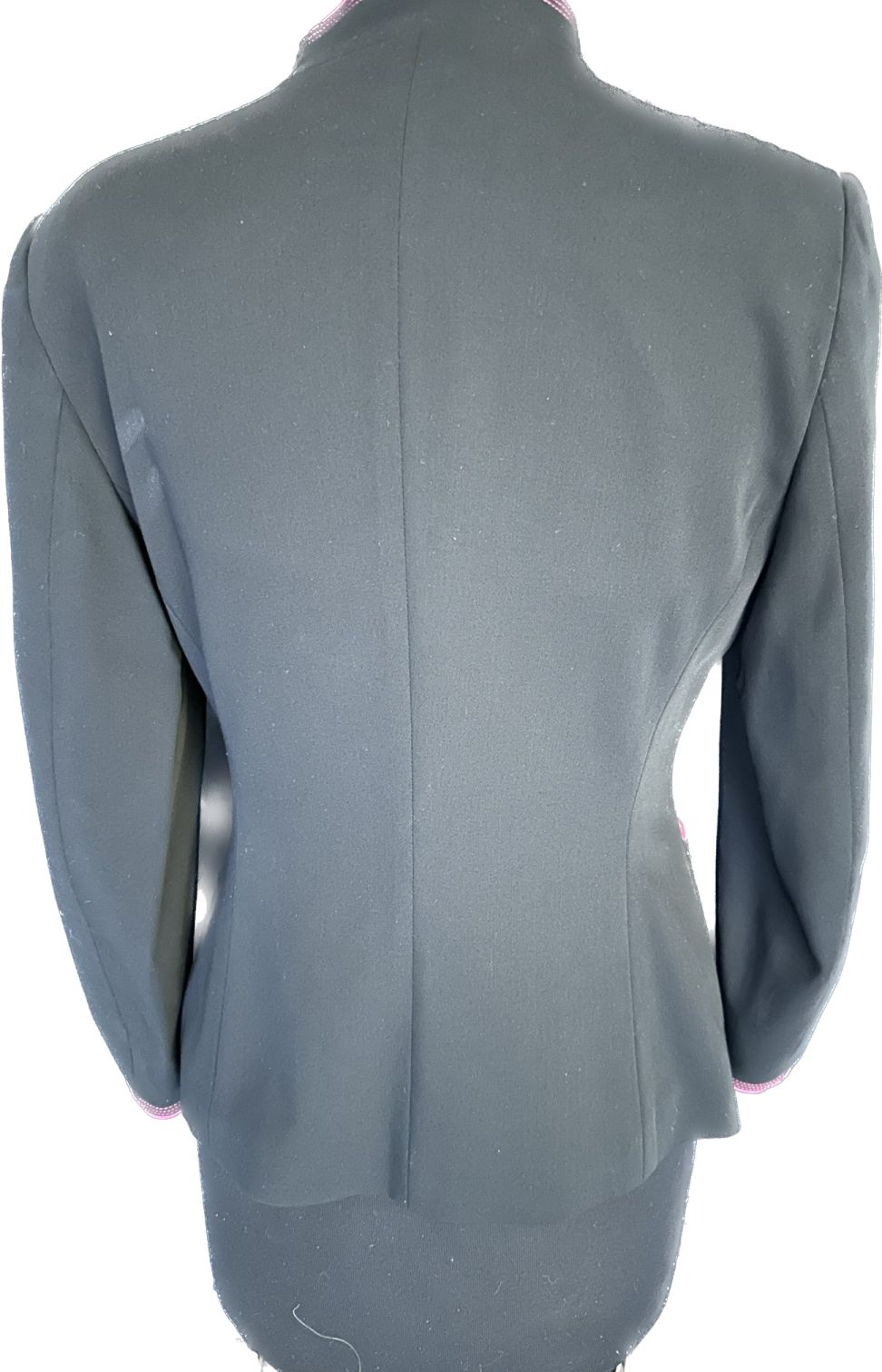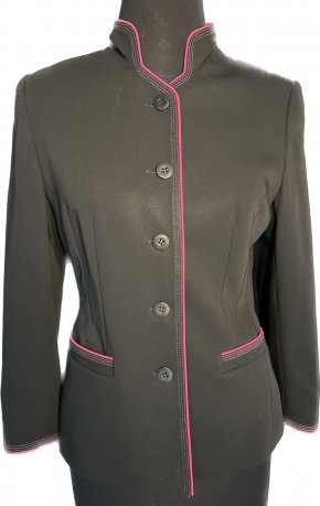 Blk gaberdine suit piped in fushia