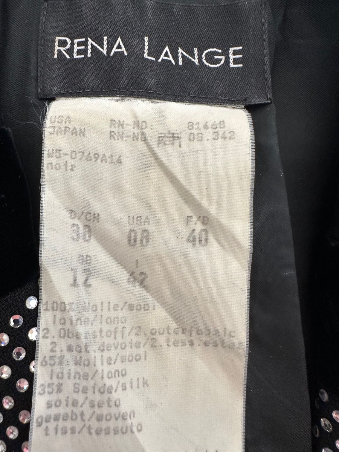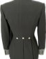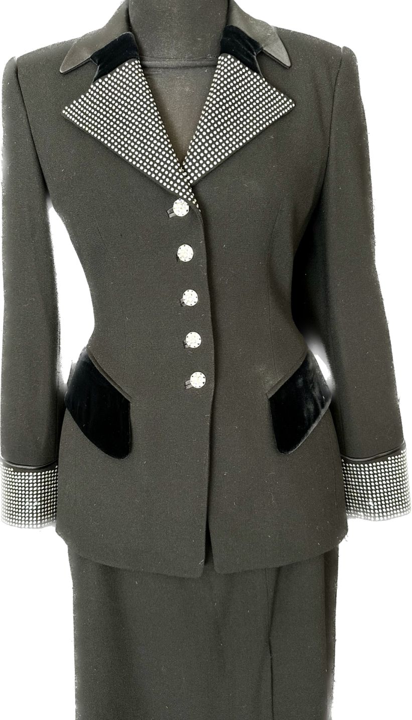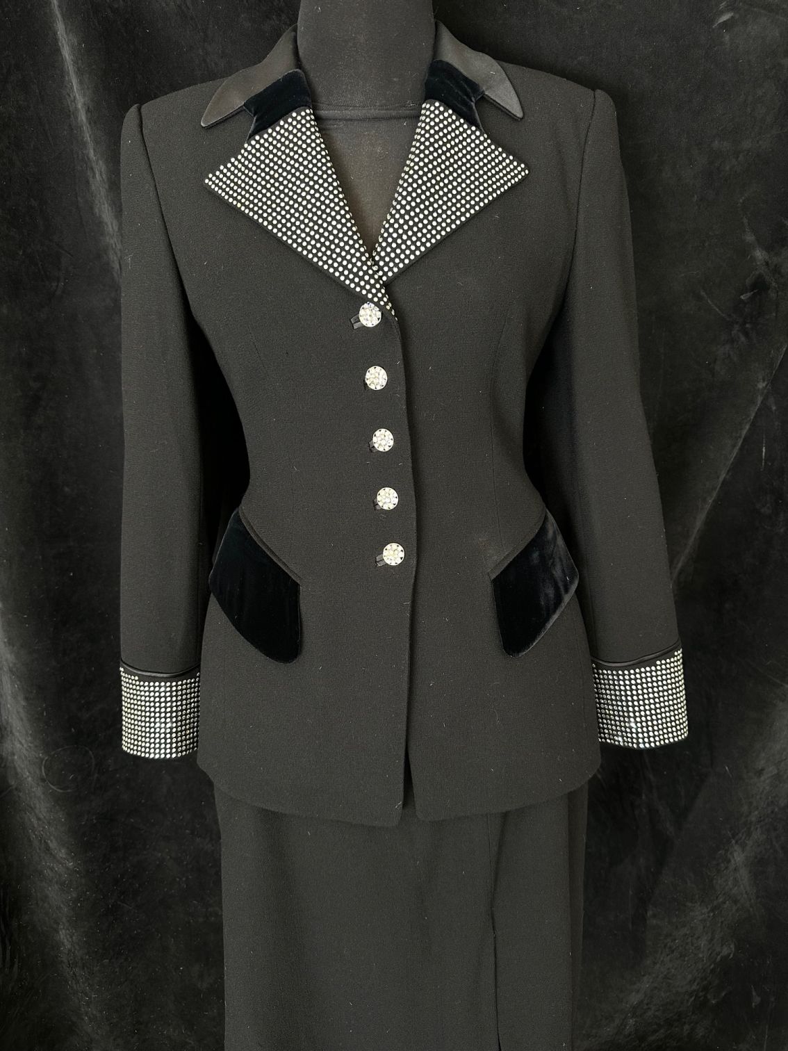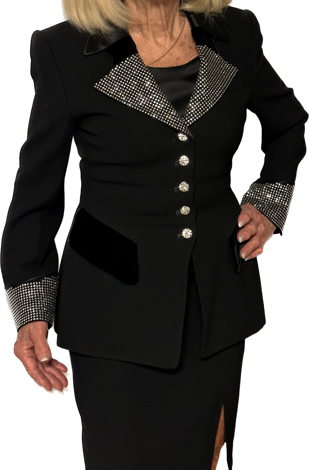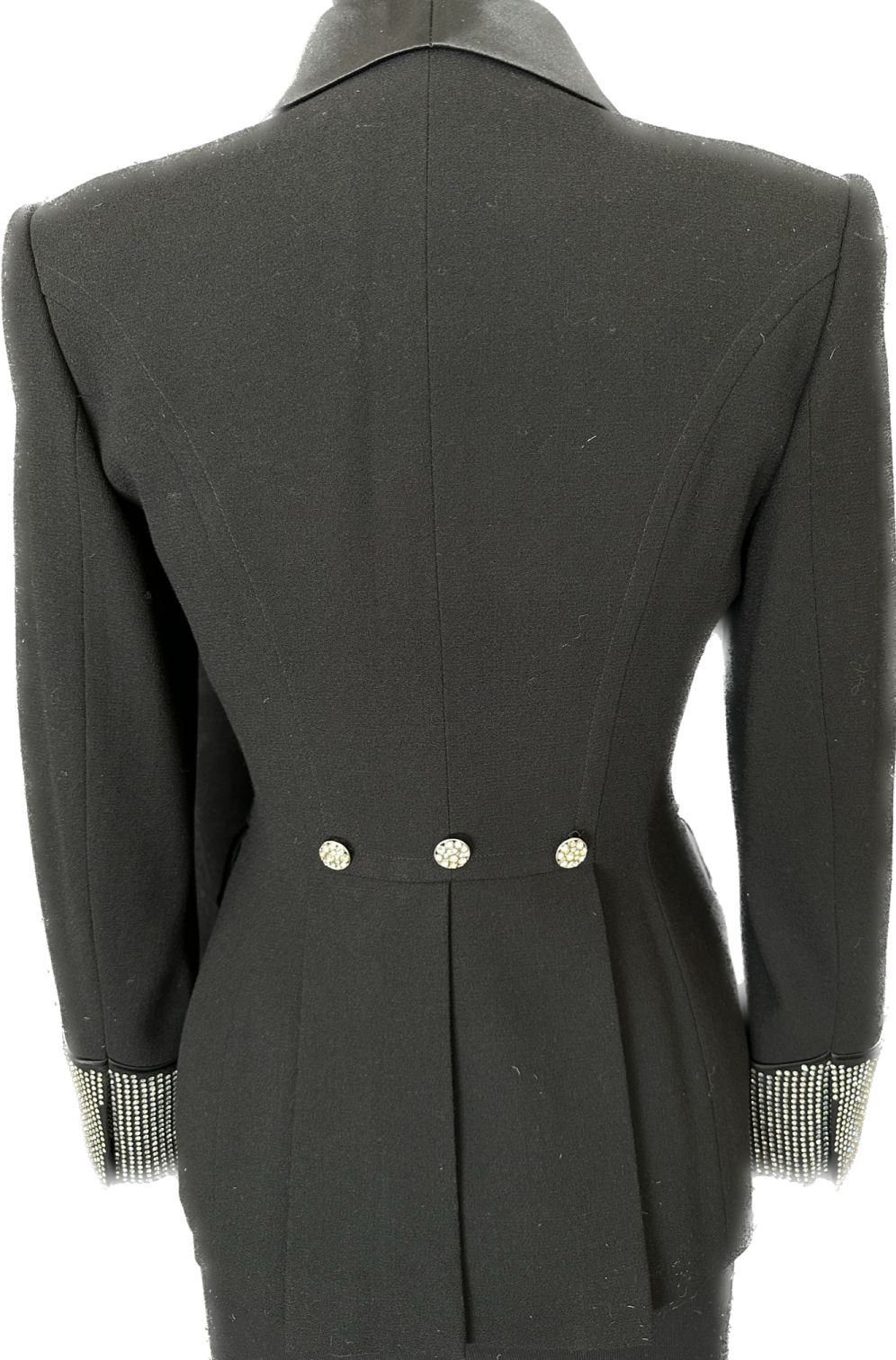 Semi fitted silhouette…… Jacket back detailed w/ three pleats & rhinestone button detail
