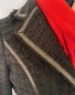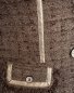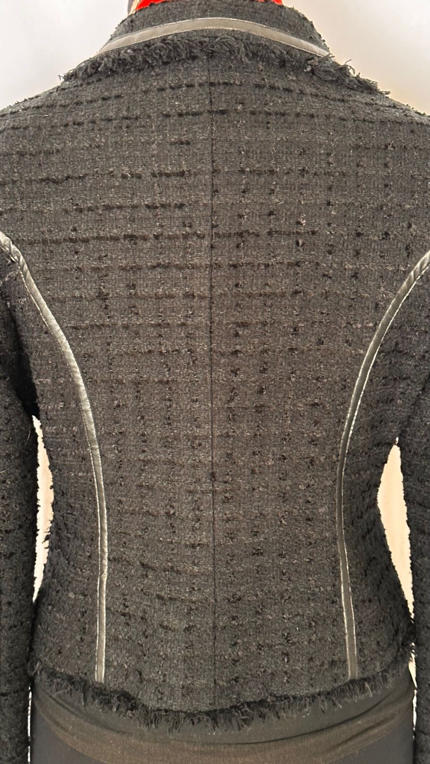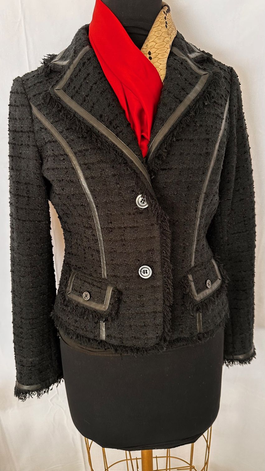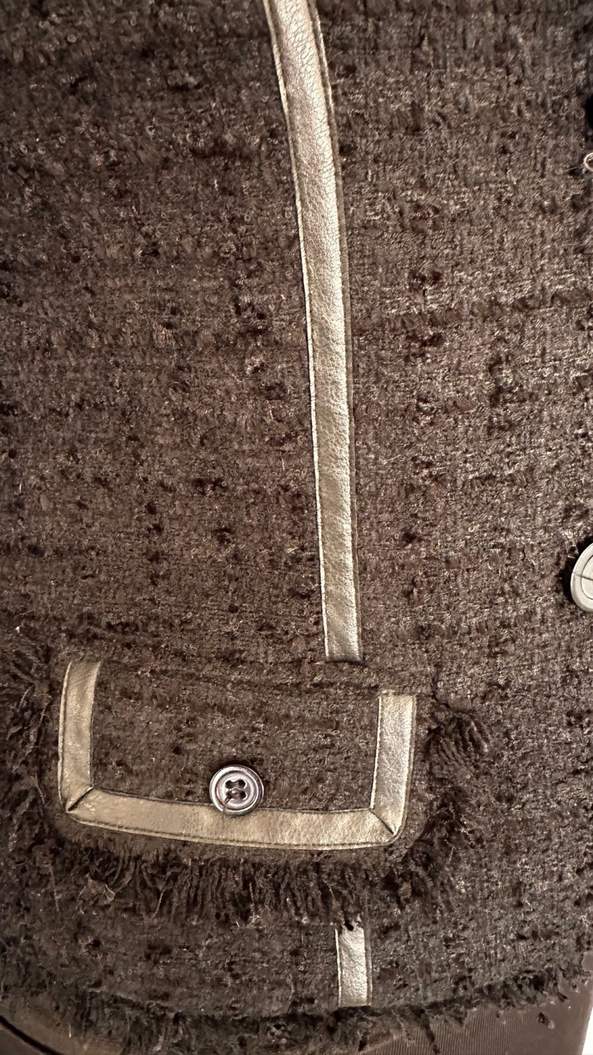 Detailed with leather piping outlining collar, flap pkts & shaped silhouette on textured chenille type fabric.