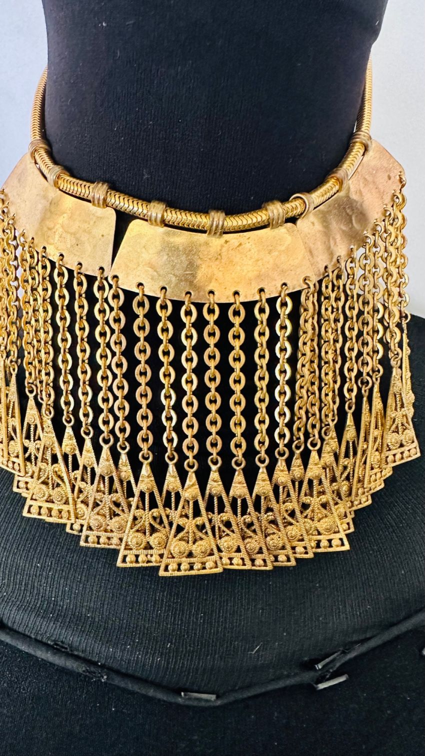 Designed with intricate detailing the choker style brass is enhanced with chains that are further enhanced with detailed triangular pieces of intricate art.