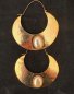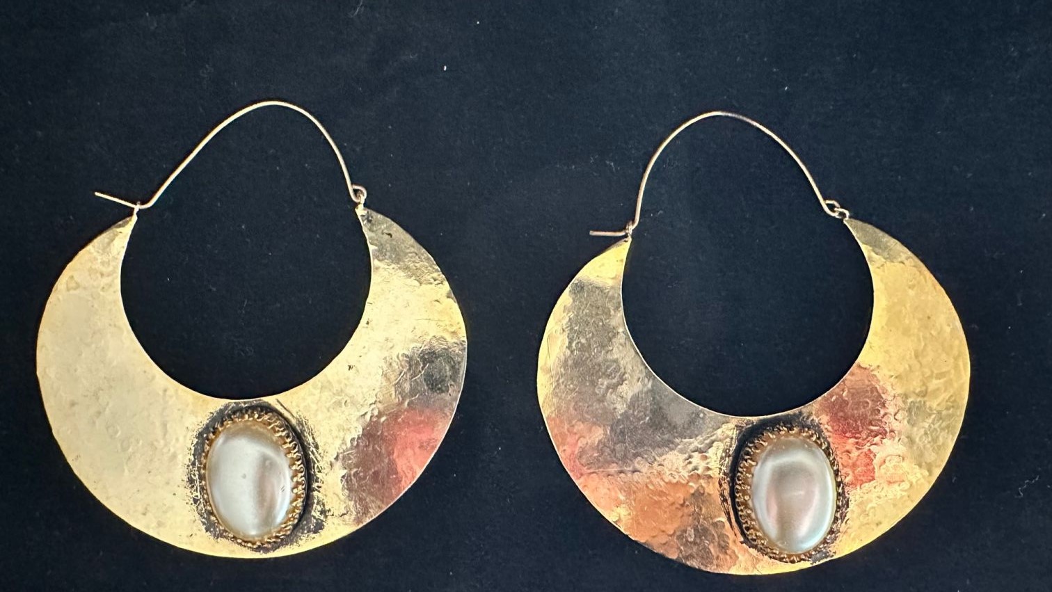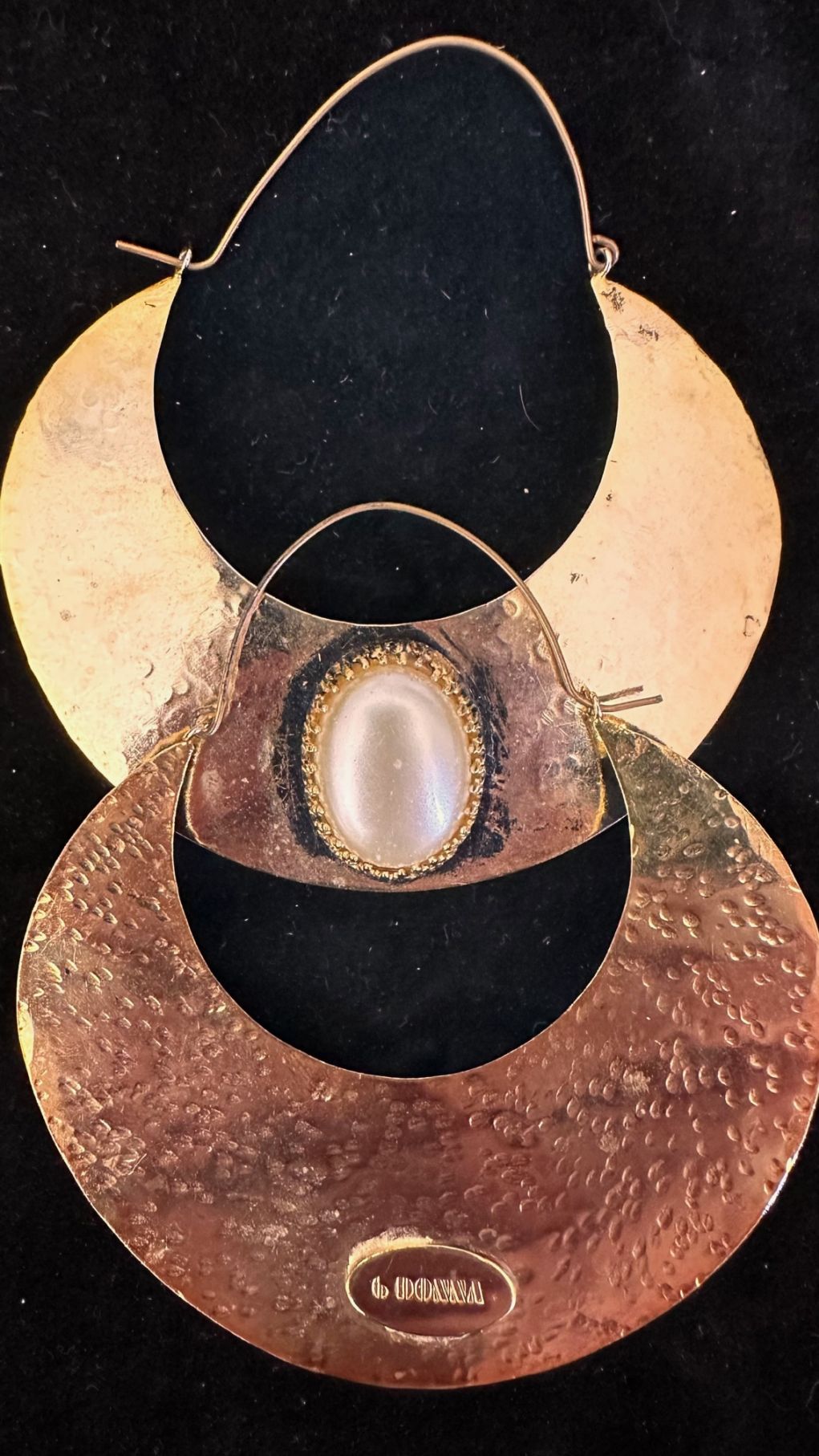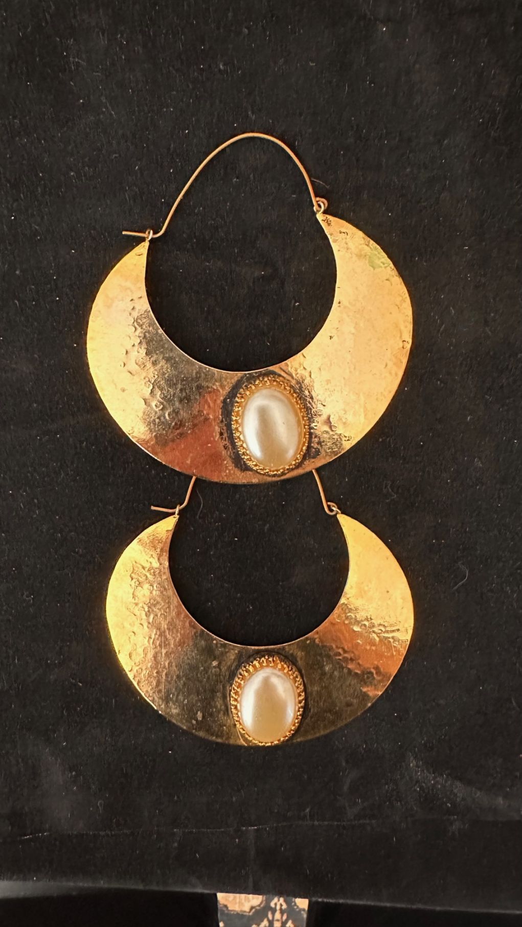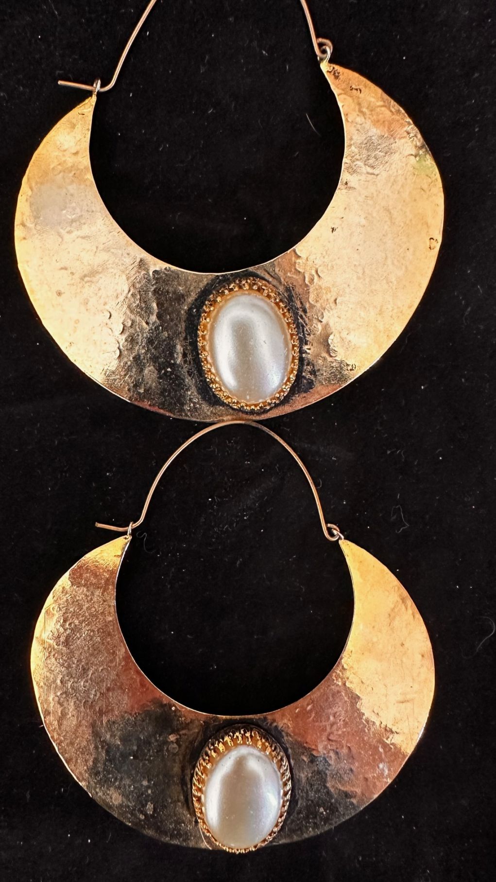 Large, Hoop Earring ,W/ faux pearl inset in hammered gold