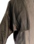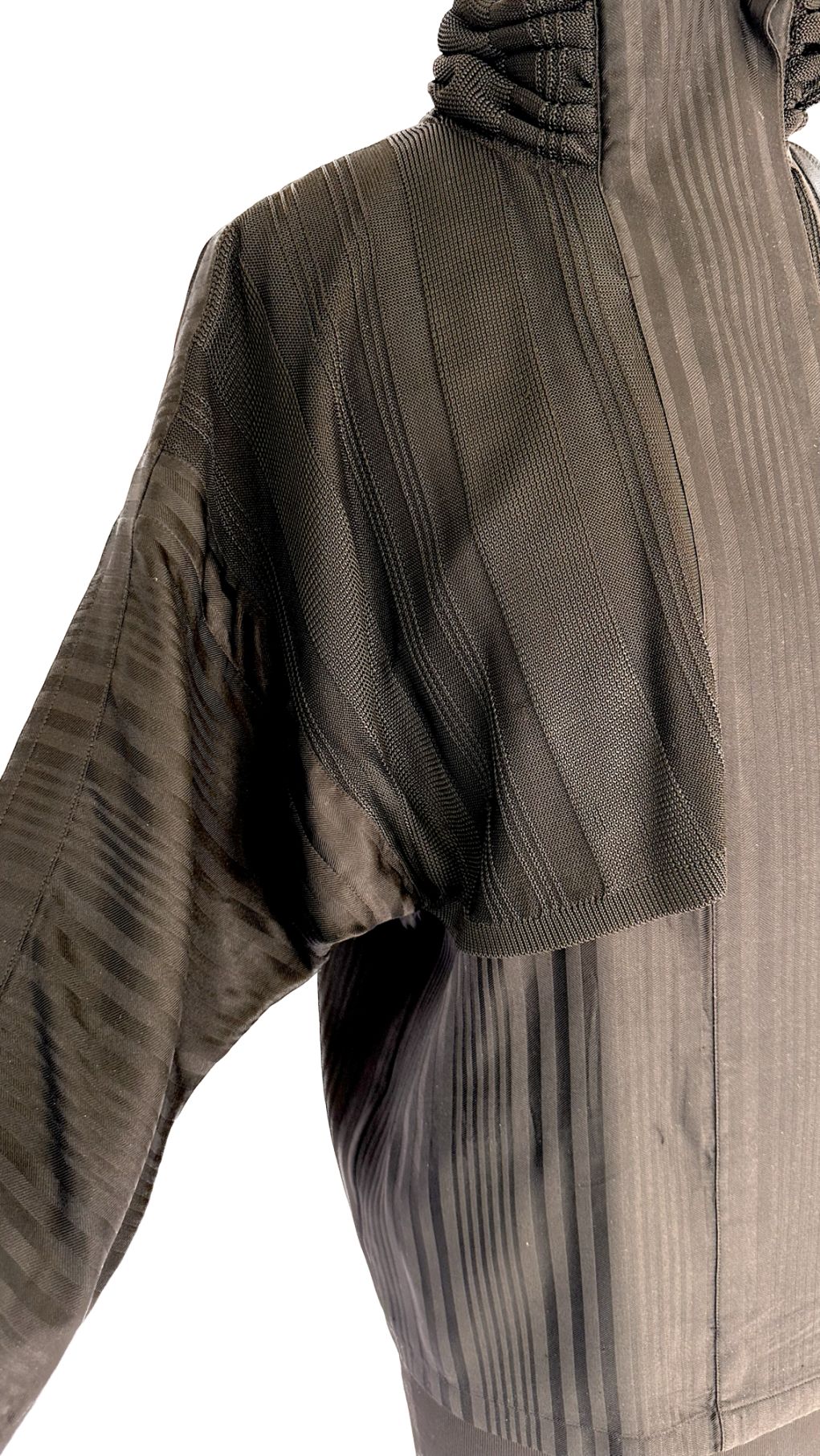 The woven silk shirt jacket, sports a shirred stand- up neckline with placket front and silk knit flange front with dolman style sleeves.