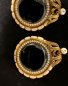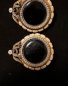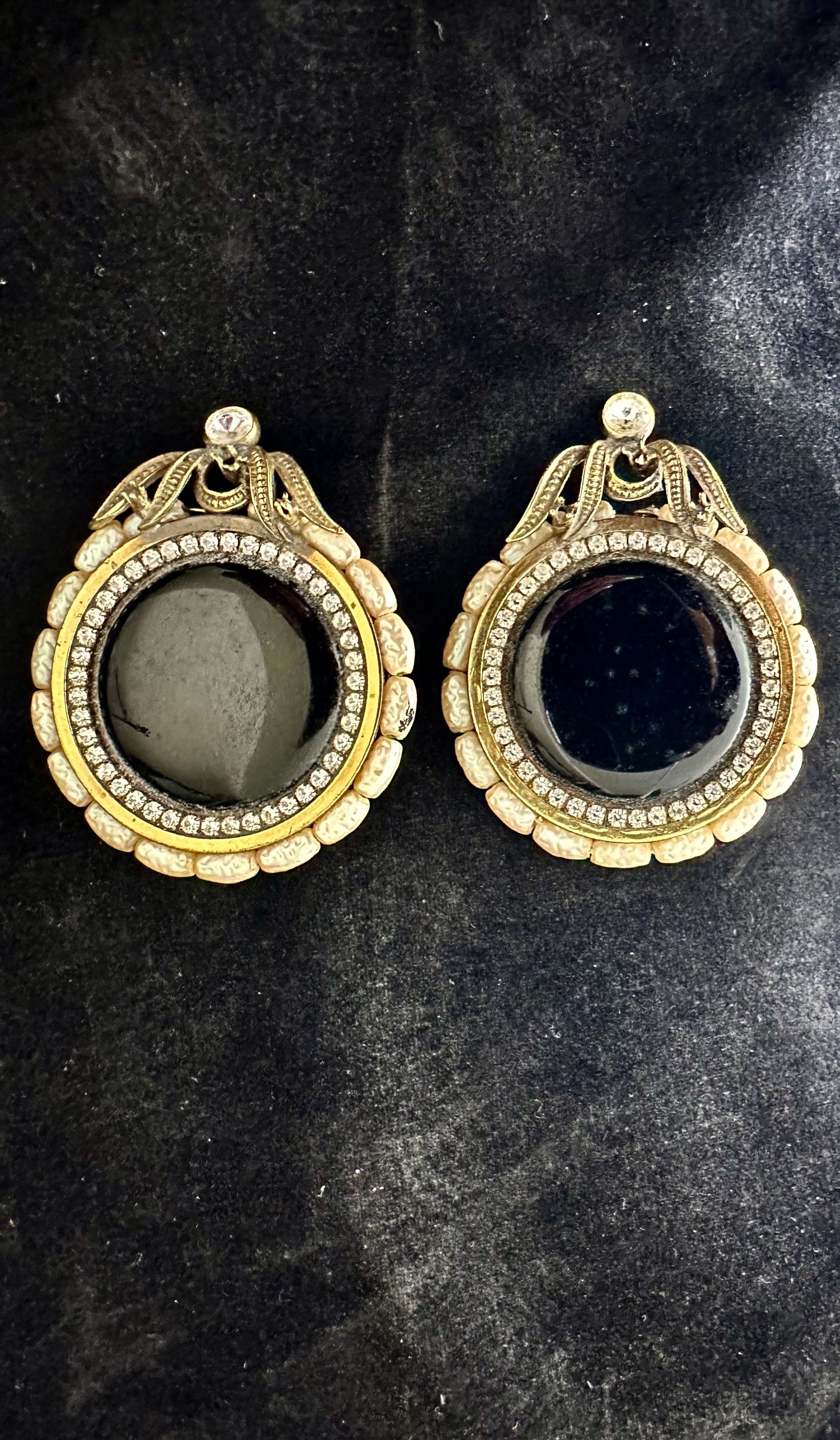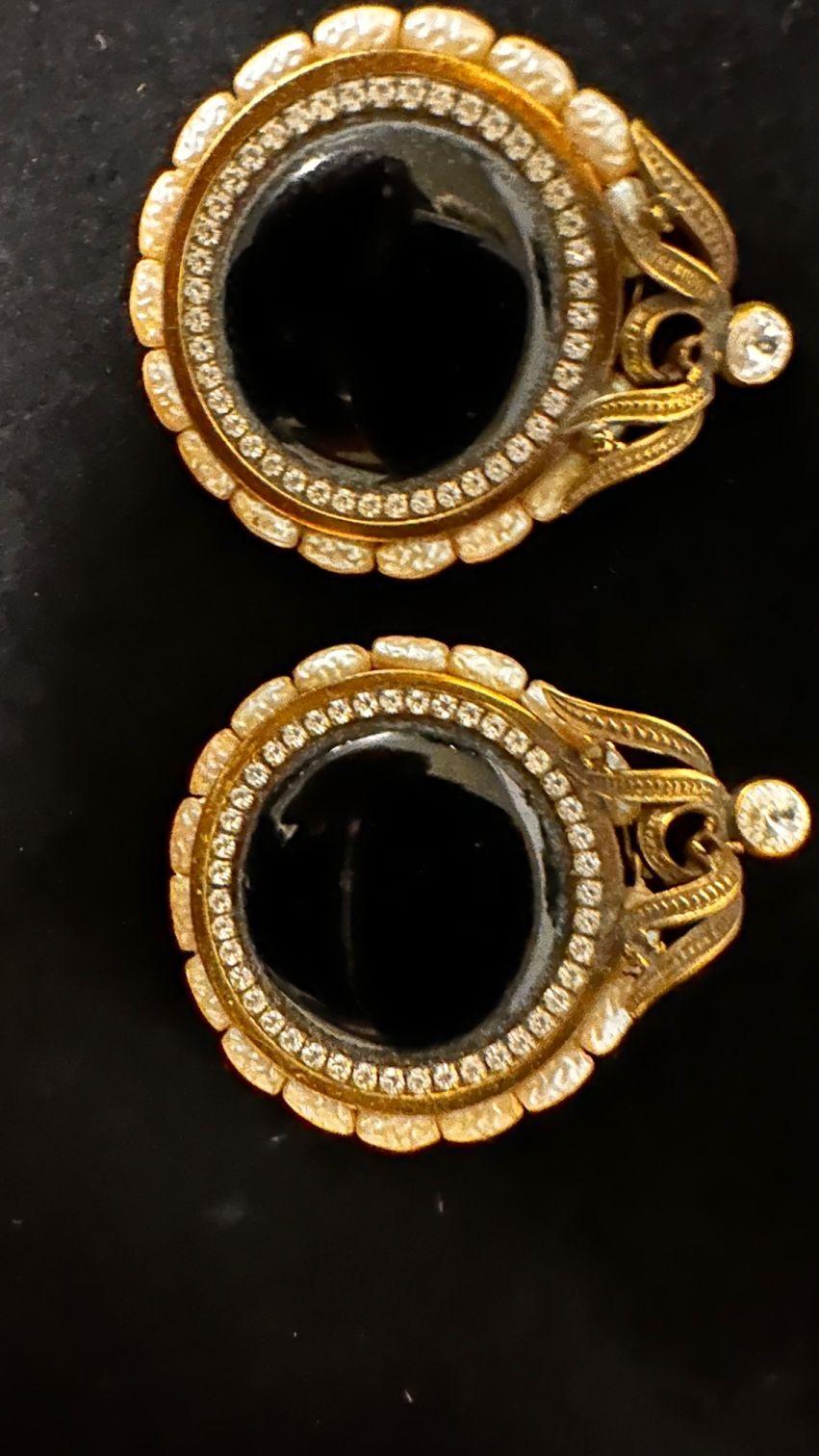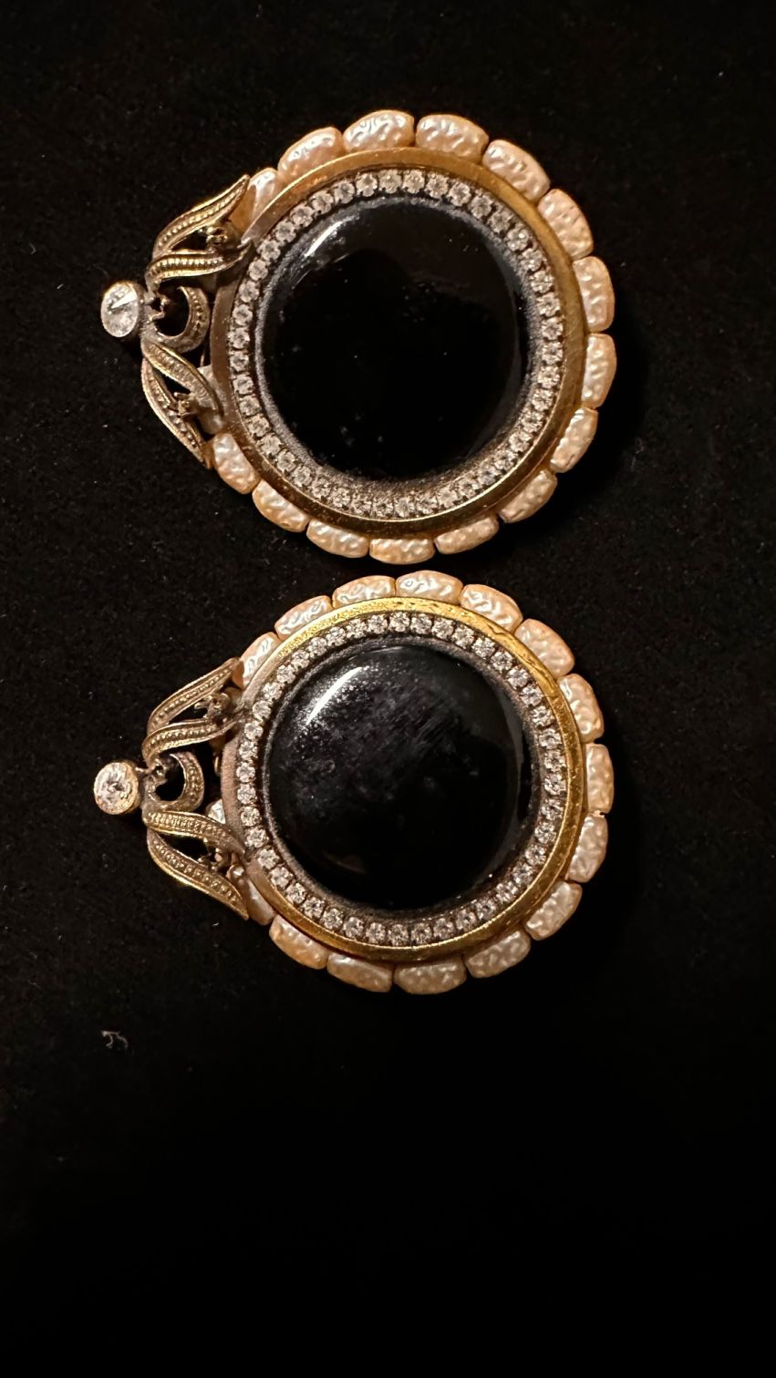 The blk onyx is surrounded by seed pearls & layered with rhinestones to enhance the onyx.